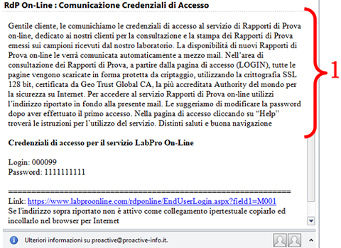 (comunicazione password e notifica nuovi Rapporti di Prova disponibili).