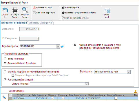 Dalla maschera di Stampa dei rapporti di prova verrà visualizzata l’informazione esportato e la data di esportazione sul WEB.
