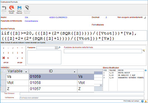L’impostazione delle formule e delle funzioni di calcolo direttamente in anagrafica prove del software consente di effettuare calcoli o comunque valutare un'espressione VBA che restituisce una stringa di testo o un valore numerico (attraverso l'utilizzo della funzione eval di VBA - Visual Basic for Applications).
